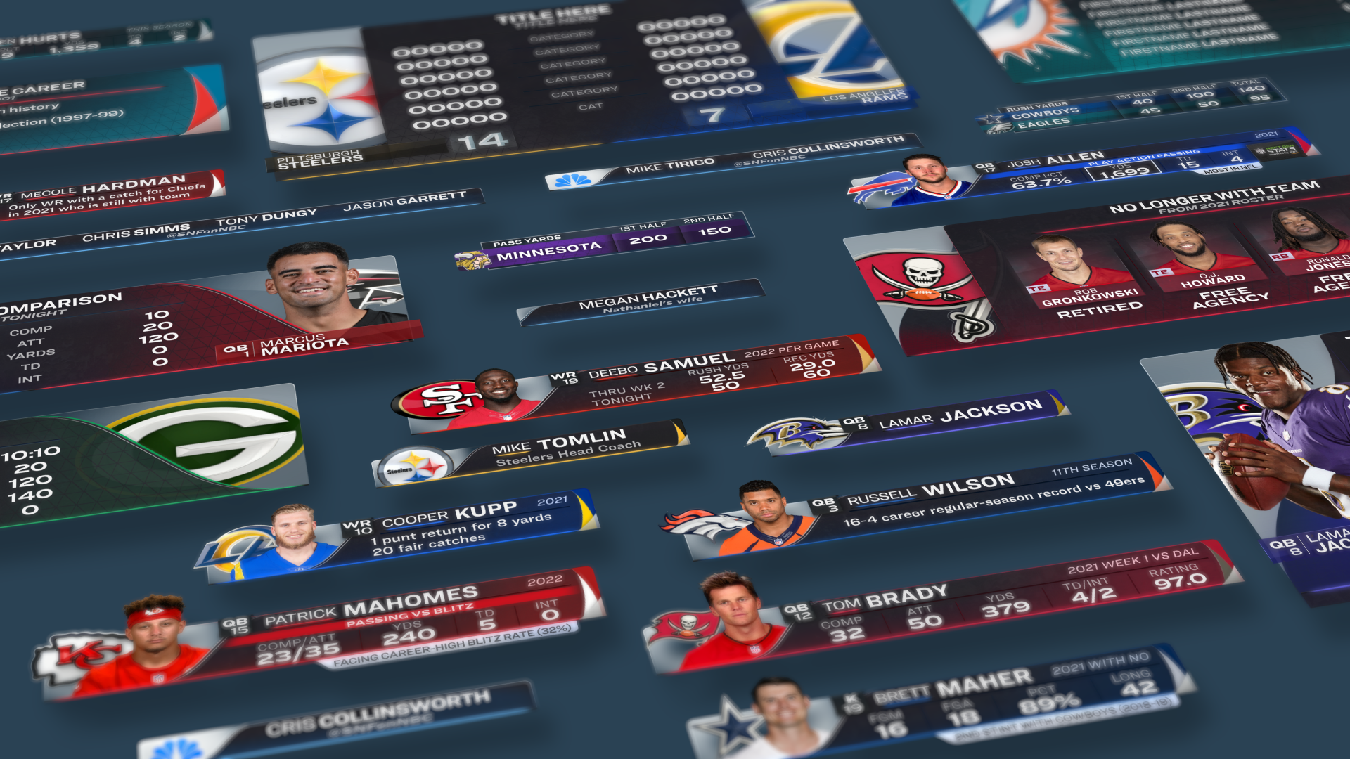Originally designed for NBC's coverage of Super Bowl LVI - the Sunday Night Football insert package was developed to encapsulate the clean, sleek & premium nature for America's #1 Primetime show, a title SNF has held since 2010; garnering 20+ million household viewers per week, on average.